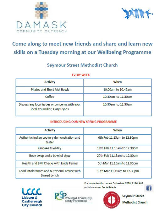 Since 2021 Damask has been organising activities on a Tuesday designed to improve general wellbeing through exercise, meeting and socialising with friends, crafts, walks and a range of other activities. Damask’s Wellbeing programme is free to those who join in, although donations by those who are able are welcomed. The Programme does not run in July or August and is closed over Christmas and Easter THE PROGRAMME FOR FEBRUARY AND MARCH 2024 is below